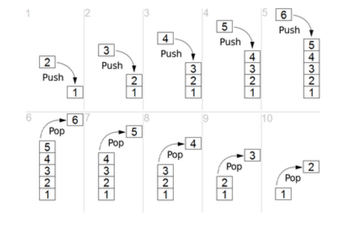 - 스택은 LIFO(Last In, Fisrt Out) 또는 FILO(First In, Last Out) 데이터 관리 방식을 따름