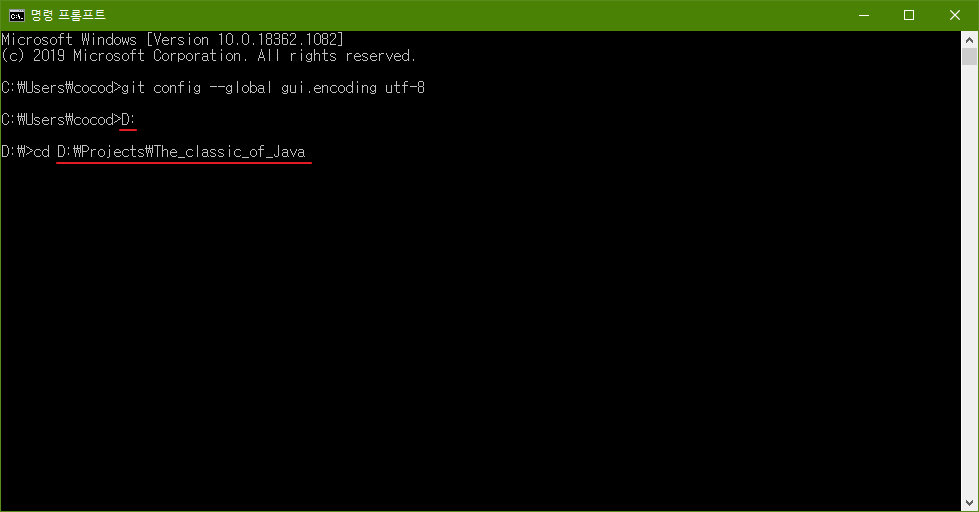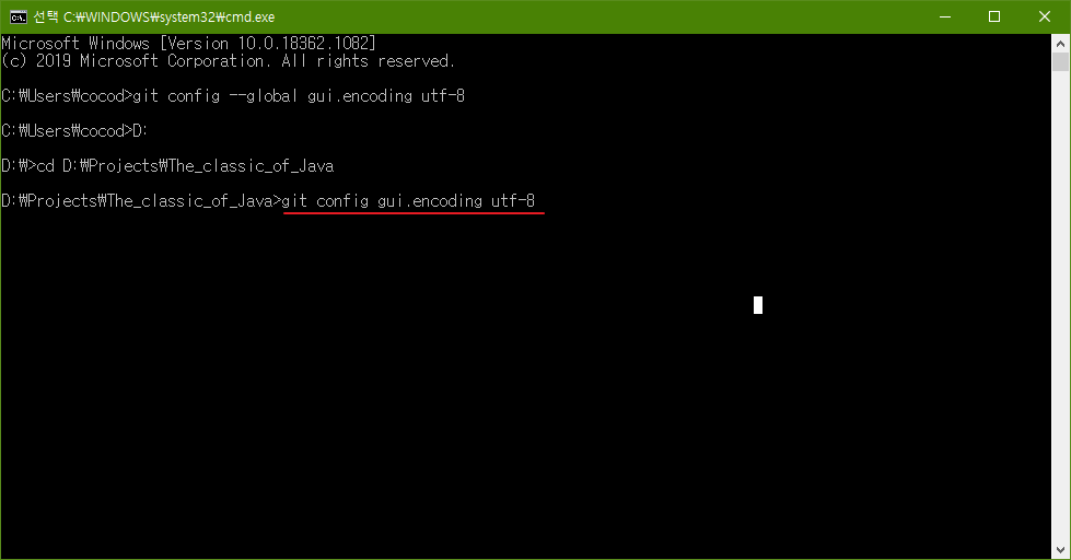 2. cmd 에서 명령어를 입력하여 git gui의 encoding을 설정한다.