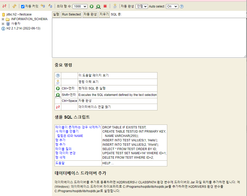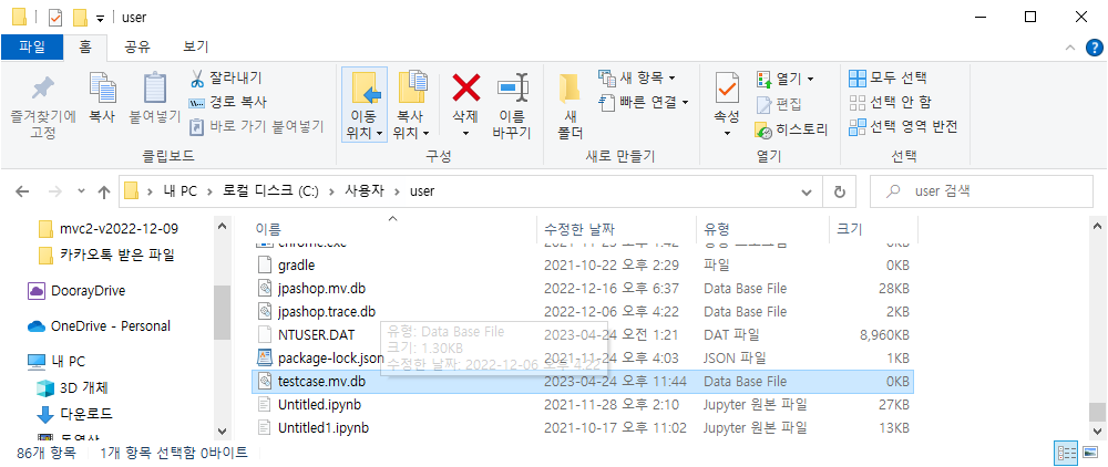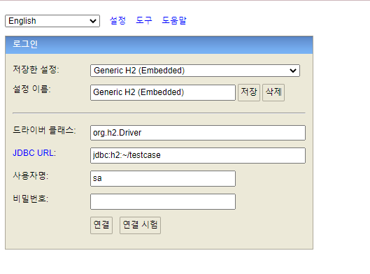 파일탐색기의 C:\Users\user 디렉토리에 해당 testcase.mv.db 파일이 없어서 생긴 문제이다.